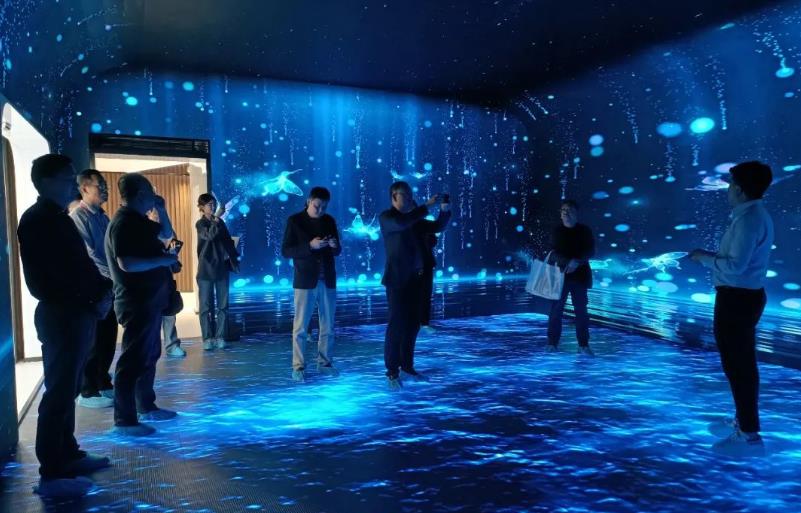 调研伊始,在乐天使智慧显示相关负责人的陪同下,来访嘉宾一行参观了乐天使南方总部展厅,体验智能显示、文旅展演、VR互动、全息剧场、AR沉浸式全景仿真系统等多个应用场景,沉浸式感受科技的魅力。